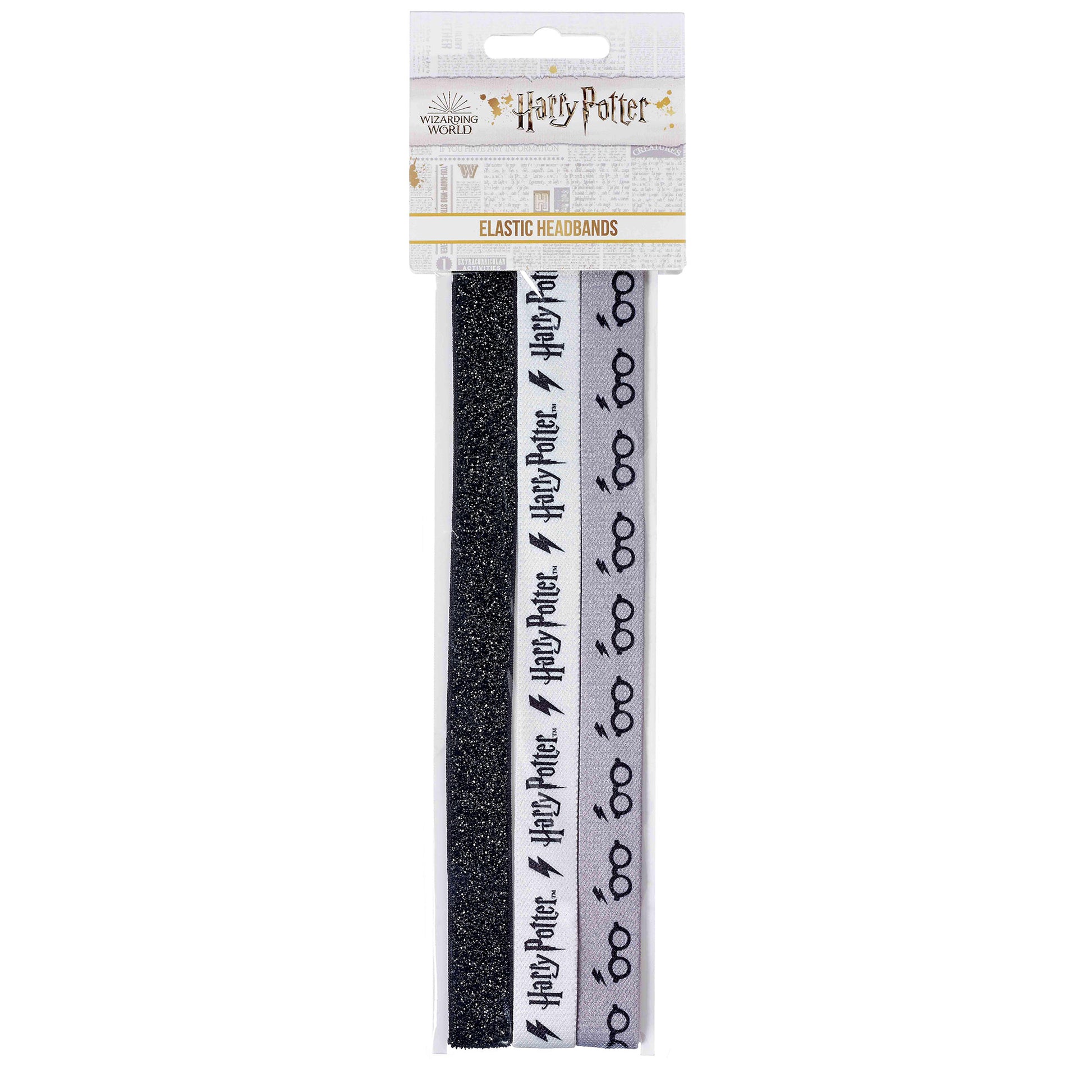 A set of three elastic headbands with the Harry Potter logo theme. Two printed and one co-ordinating glitter band.