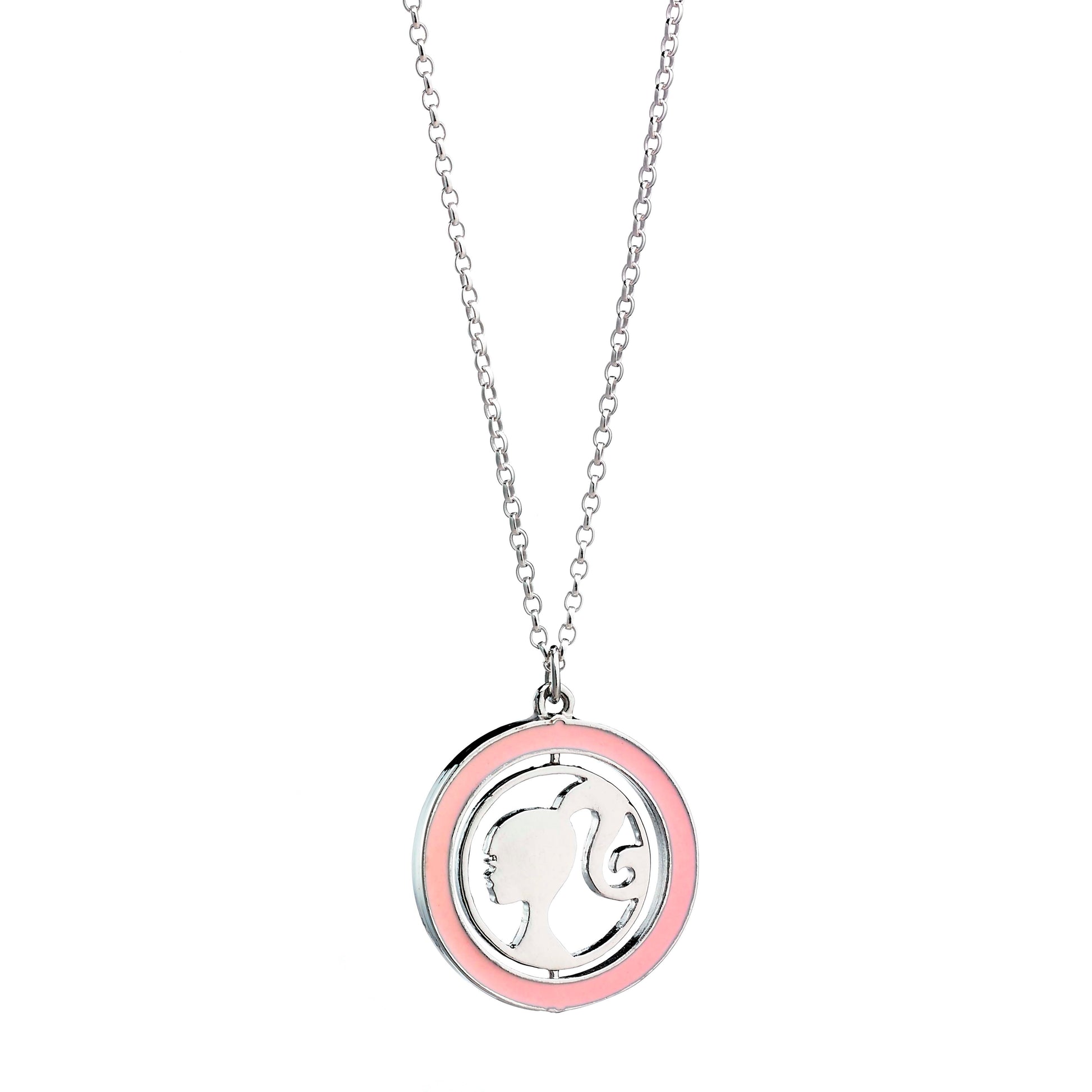 The Barbieâ„¢ï¸ Spinning Silhouette Necklace has an eye-catching pink enameled outer ring with a spinning silhouette pendant. Its a must have jewellery accessory for all Barbie fans. It looks great from age 14 to adult - plus, it's part of an official jewellery collection! Enjoy wearing the necklace as the 65cm silver tone chain sits perfectly. Dive into fun just like Barbieâ„¢ï¸ would with this beautiful piece. It looks great from age 14 to adult - plus, it's part of an official jewellery collection!