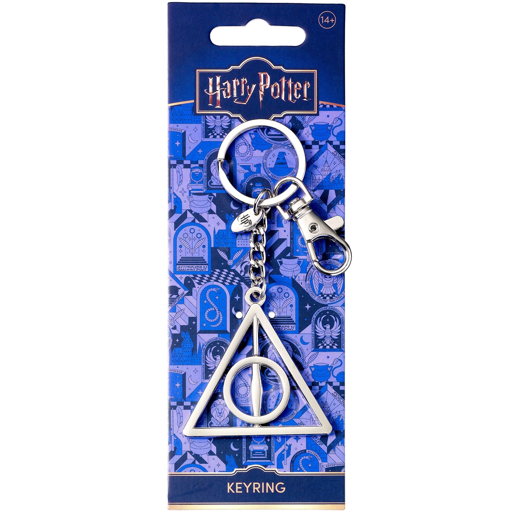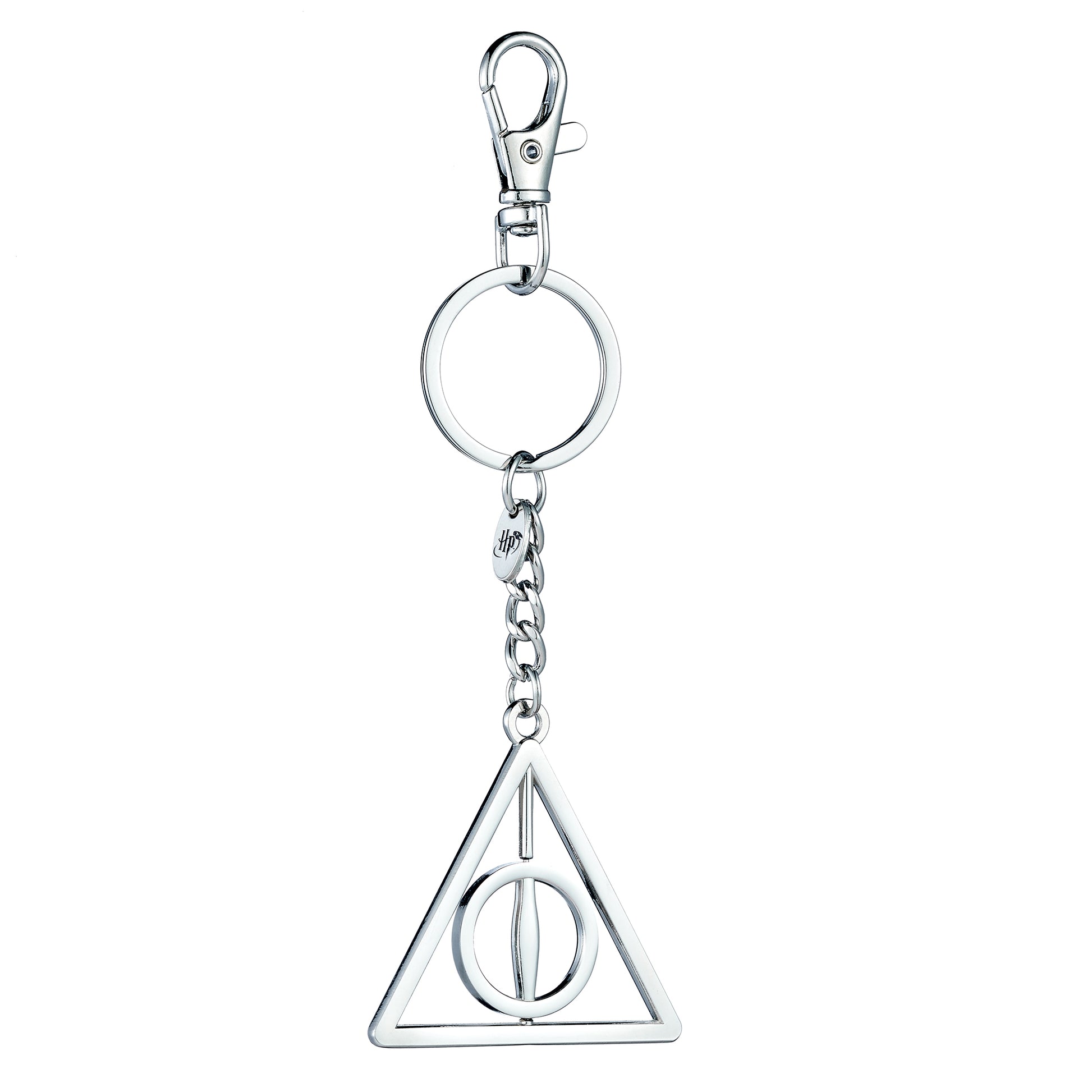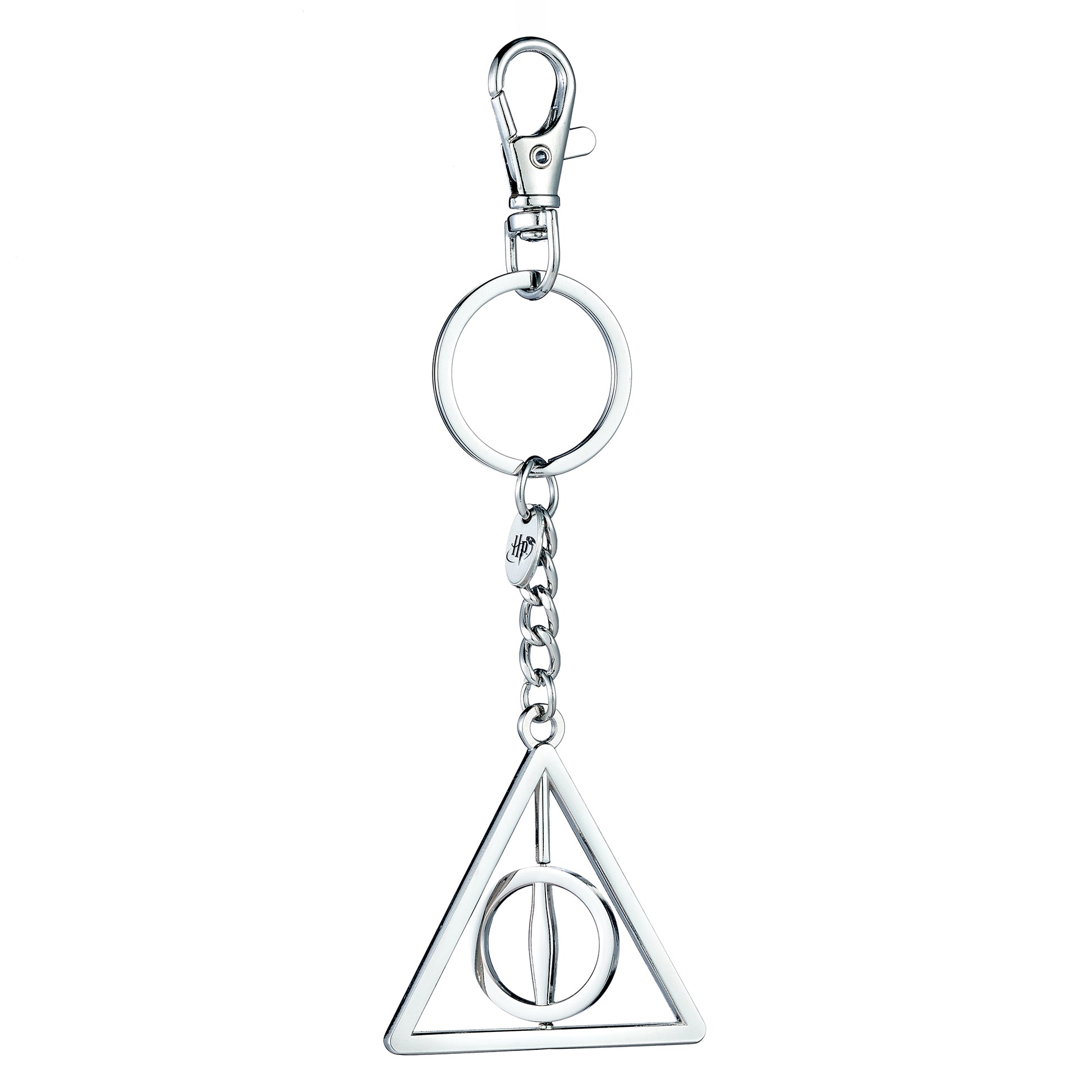 Keep your keys secure with this Harry Potter Deathly Hallows keyring featuring a spinning center and handy ring and clip. Showcasing the iconic symbol of the cloak of Invisibility, resurrection stone, and elder wand—the three legendary magical items—this keyring is a must-have for fans aged 14 and up. Officially licensed and full of wizarding charm!