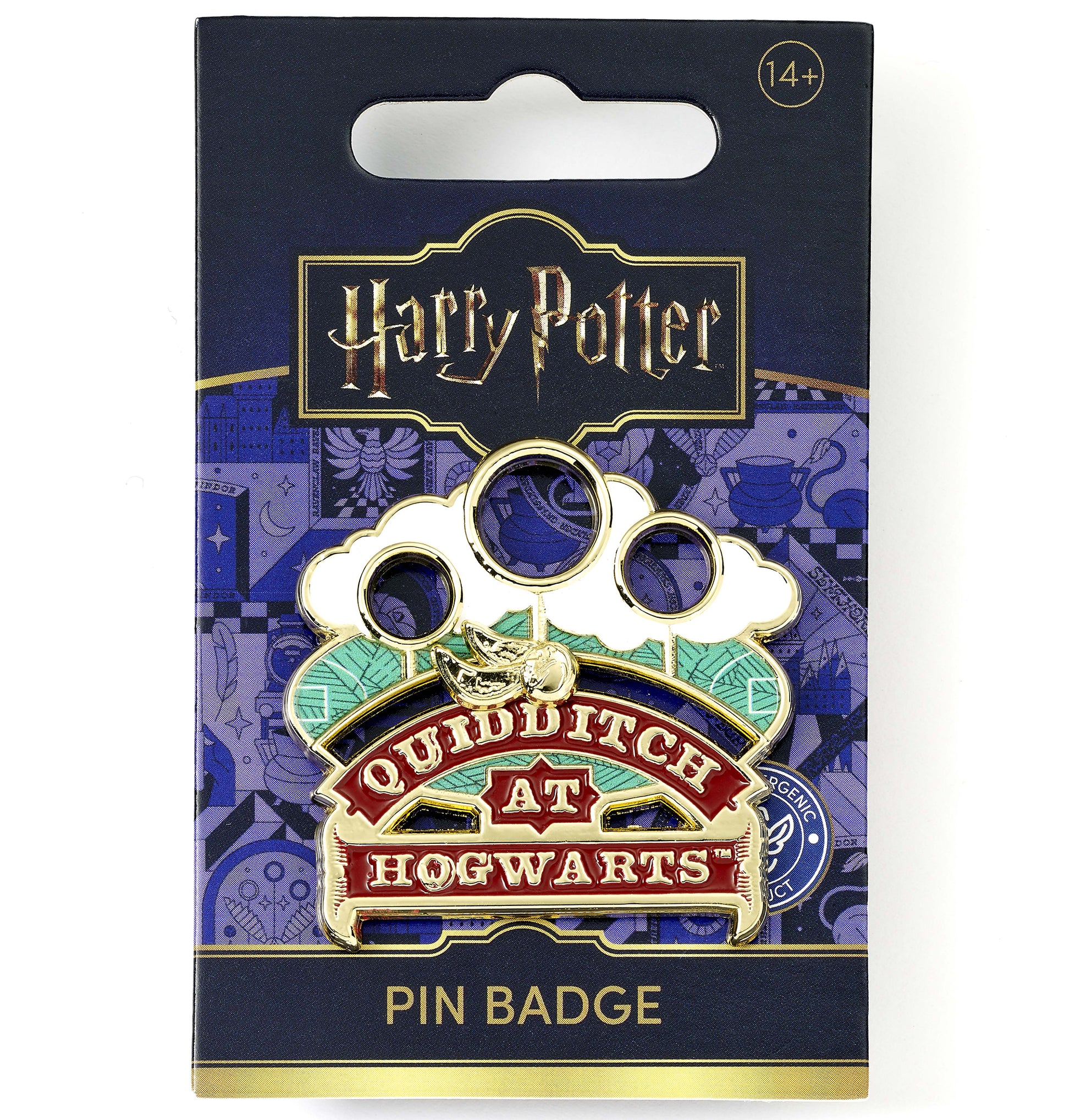 Unlock your wizarding skills with this officially licensed Harry Potter Quidditch pin badge! The dynamic design features hoops and a sliding Golden Snitch, perfect for wearing on clothes or accessories. Suitable for all ages 14 and up.