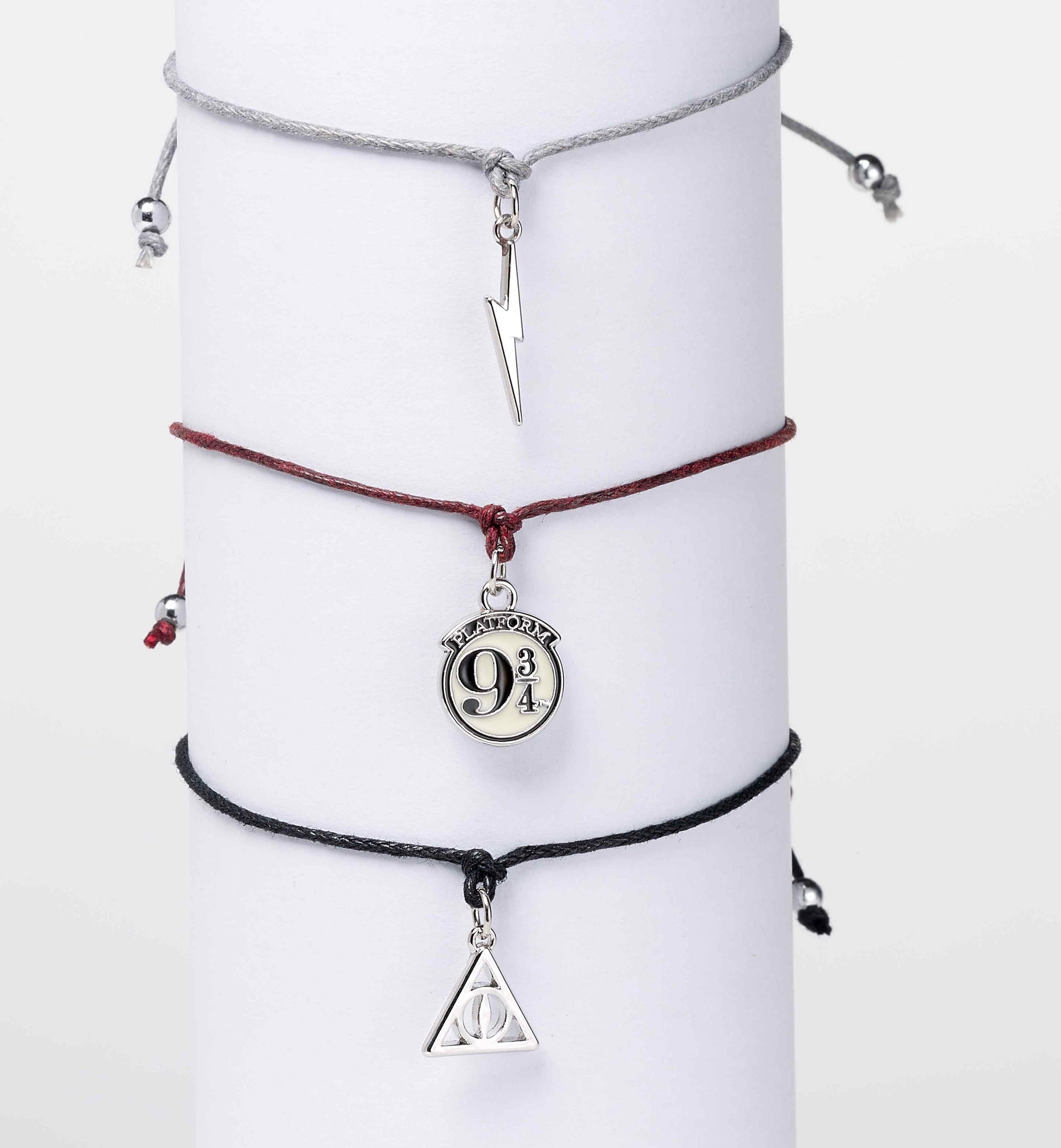 A collectable friendship bracelet set featuring the classic charms of Platform 9 3/4, Lightning Bolt & Deathly Hallows charm on a nylon cords. Wear them layered and swop with friends.
