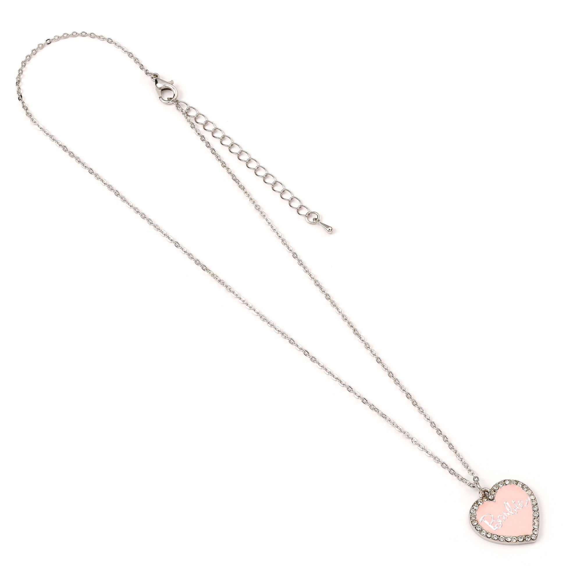 Pink Enamel Heart Pendant necklace with a Barbieâ„¢ï¸ logo in the center of a pink enamel heart edged with crystals. This classic pendant is styled in Barbies favourite colour of soft pink. Delicate, sparkly, and timeless just like Barbie herself. The silver tone 40cm trace chain has a 5cm extender. Perfect for age 14 to adult and is part of an official jewellery collection. Try the Barbieâ„¢ï¸ Pink Enamel Heart Pendant Necklace and express your unique style with timeless elegance!